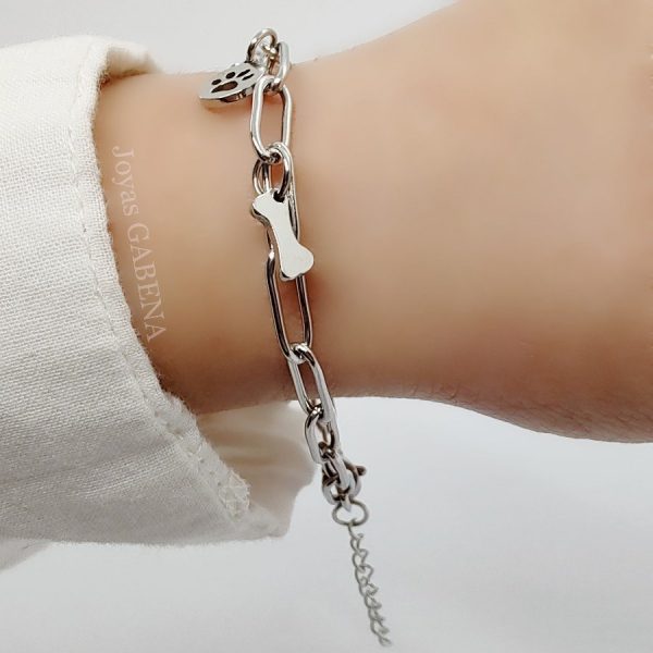 Pulsera Dijes Perrito Huellita Hueso. Medidas: 18cm extensible a 21cm- Dijes de 8 a 10mm.. Material acero quirúrgico 316L.